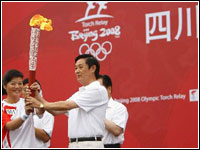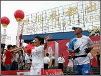 ผู้วิ่งคบเพลิงรายแรกคือ จาง ซาน แชมป์ยิงปืนโอลิมปิกชาวเสฉวน