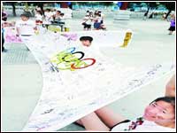 สํานักข่าวแห่งประเทศจีนรายงานว่า ช่วงต้นปีนี้ นักศึกษาจีนที่เรียนในต่างประเทศ 5 คนเริ่มริเริ่มกิจกรรมเซ็นชื่ออวยพรงานกีฬาโอลิมปิกปักกิ่งในมหาวิทยาลัยและประเทศที่ตนพํานักอยู่ เชิญชวนให้นักเรียนจีนที่เรียนในต่างประเทศเซ็นชื่อเชียร์โอลิมปิกปักกิ่ง ภายในเวลาครึ่งปี พวกเขาได้ลายเซ็นของนักศึกษาจากสถาบันอุดมศึกษากว่า 80 แห่งในสหรัฐฯ อังกฤษ และสวีเดนเป็นต้น วันที่ 6 สิงหาคมนี้ สมาชิก 5 คนของสหพันธ์อาสาสมัครนักเรียนจีนที่เรียนในต่างประเทศชุมนุมกันที่กรุงปักกิ่งจัดแสดงลายเซ็นบนผืนผ้ากว่า 30 ผืน ซึ่งนายบิล คลินตัน อดีตประธานาธิบดีสหรัฐฯก็ร่วมเซ็นอวยพรงานกีฬาโอลิมปิกปักกิ่งด้วย
