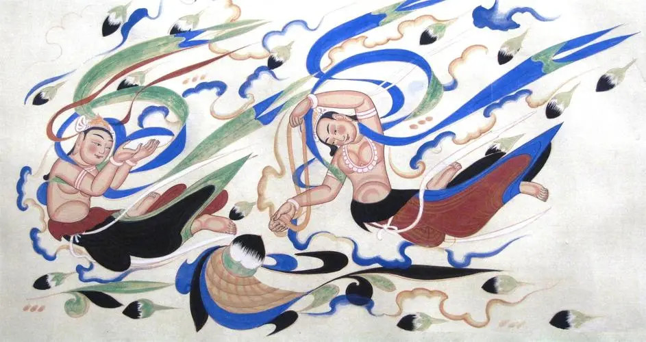 “เฟยเทียน” หรือนางฟ้าล่องรอยในอากาศ เป็นเอกลักษณ์ของศิลปะถ้ำแห่งตุนหวง เล่ากันว่า “เฟยเทียน” ทั้งหมดมีจำนวน 6,333 รูป “เฟยเทียน” เหล่านี้ไม่มีความแตกต่างระหว่างชายและหญิง และไม่มีความแตกต่างระหว่างหน้าที่ “เฟยเทียน” จะไม่แตะต้องไวน์และเนื้อสัตว์ โดยถือธูปเป็นอาหาร เมื่อพระพุทธเจ้าทรงปรากฏ ย่อมจะมี “เฟยเทียน” อยู่ล้อมรอบ ทุกครั้งที่จัดงานทางพุทธศาสนาบนสวรรค์ “เฟยเทียน” จะปฏิบัติงานโยนดอกไม้ และร้องรําทำเพลง เพื่อถวายแด่พระพุทธเจ้า