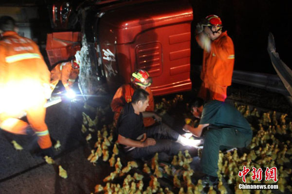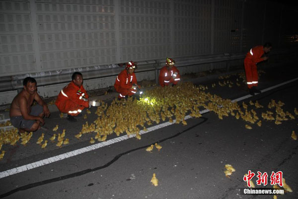 เช้าตรู่วันที่ 26 กรกฎาคมที่ผ่านมา เกิดอุบัติเหตุรถบรรทุกลูกเป็ดคันหนึ่ง ชนท้ายรถพ่วง บนทางด่วนสายปักกิ่ง-ไทเปช่วงขาออกเถิงเป่ย มุ่งสู่ทางทิศใต้ คนขับและผู้โดยสารรวม 3 คนติดอยู่ในรถ แต่ลูกเป็ดหลายพันตัวกลับวิ่งวุ่นเต็มทางด่วน