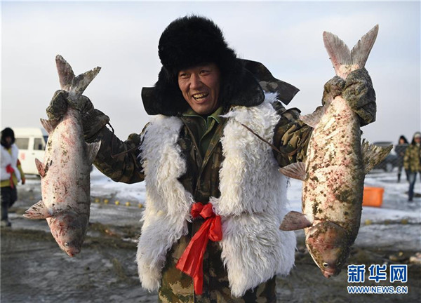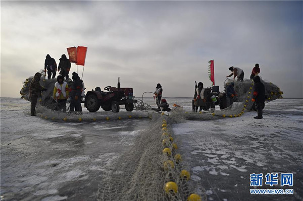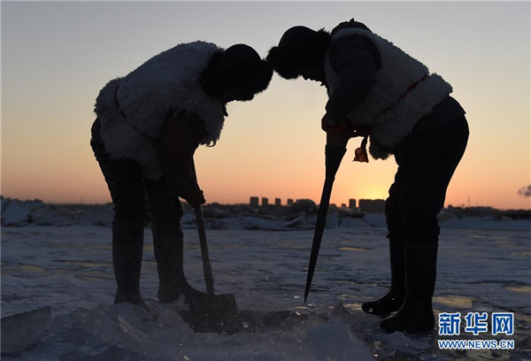 ชาวประมงกำลังจับปลาในทะเลสาบอั้วหลง อำเภอคังผิง มณฑลเหลียวหนิง ซึ่งน้ำในทะเลสาบได้กลายเป็นน้ำแข็ง ฤดูหนาวเป็นอีกฤดูหนึ่งที่เหมาะกับการจับปลาเพราะปลาในฤดูหนาวจะอ้วนและเนื้ออร่อย